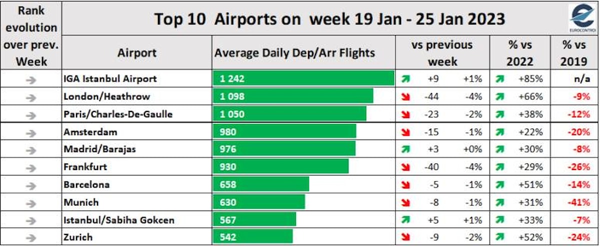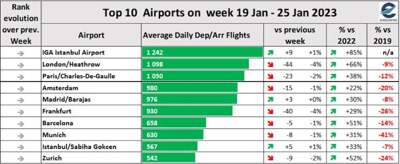 Bu rakam salgın öncesi dönemi ifade eden 2019 yılının yüzde 84’üne denk gelirken, son üç yıldır Avrupa'daki havalimanları arasında üst sırada yer alan İGA İstanbul Havalimanı, ocak ayının dördüncü haftasında da liderliğini sürdürdü.