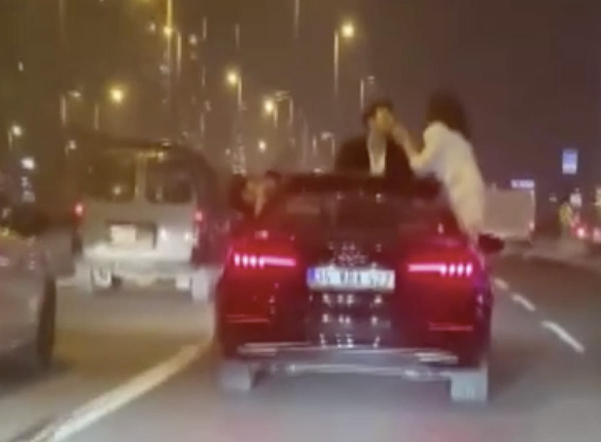Trafikte seyir halindeki aracın sunroof'undan ve camından çıkan bir erkek ve kadın, canlarını hiçe sayarken trafikte bulunan diğer araçları tehlikeye attı.