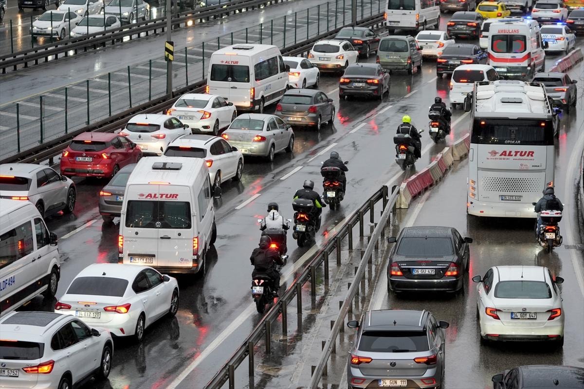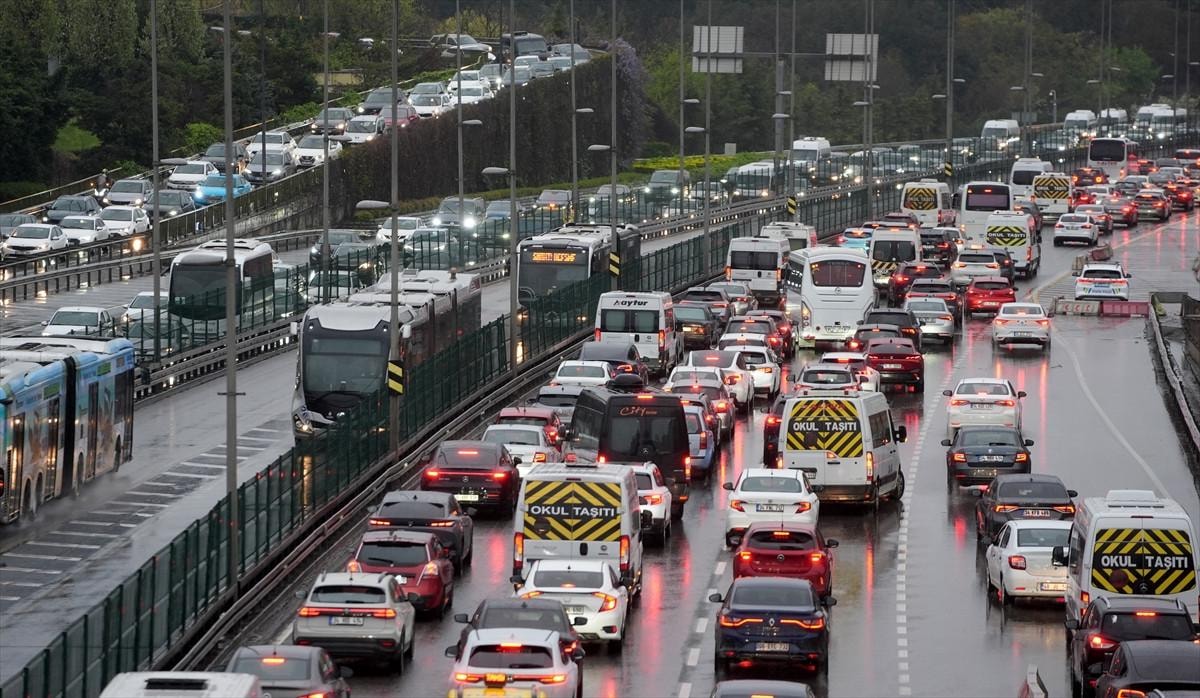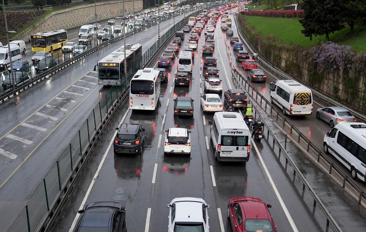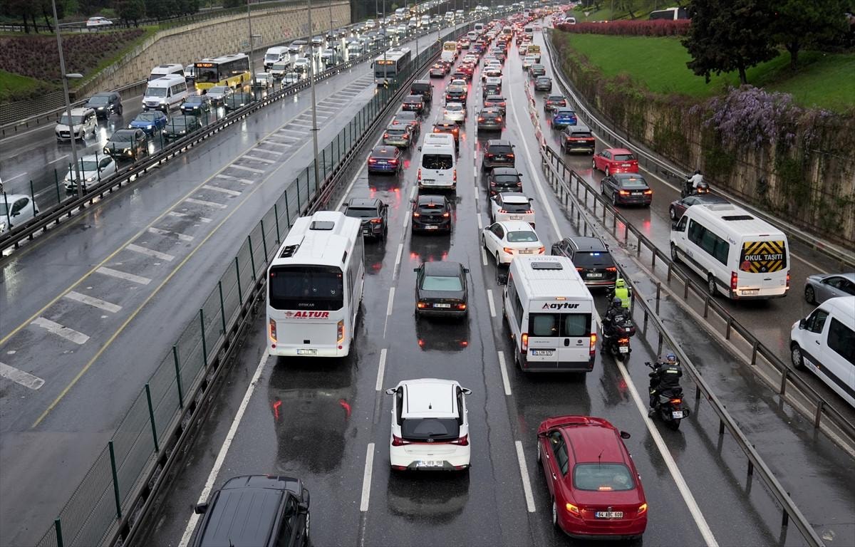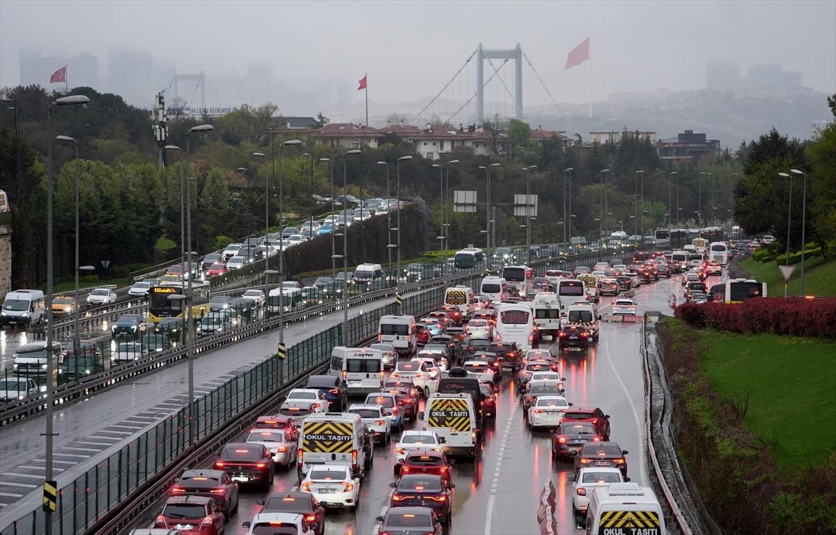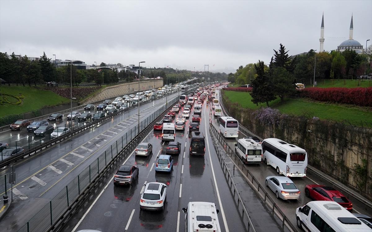 İstanbul'da Ramazan Bayramı tatilinin ardından haftanın ilk iş gününde yağışlı havanın da etkisiyle trafik yoğunluğu yaşanırken, bazı bölgelerde araçlar güçlükle ilerliyor.