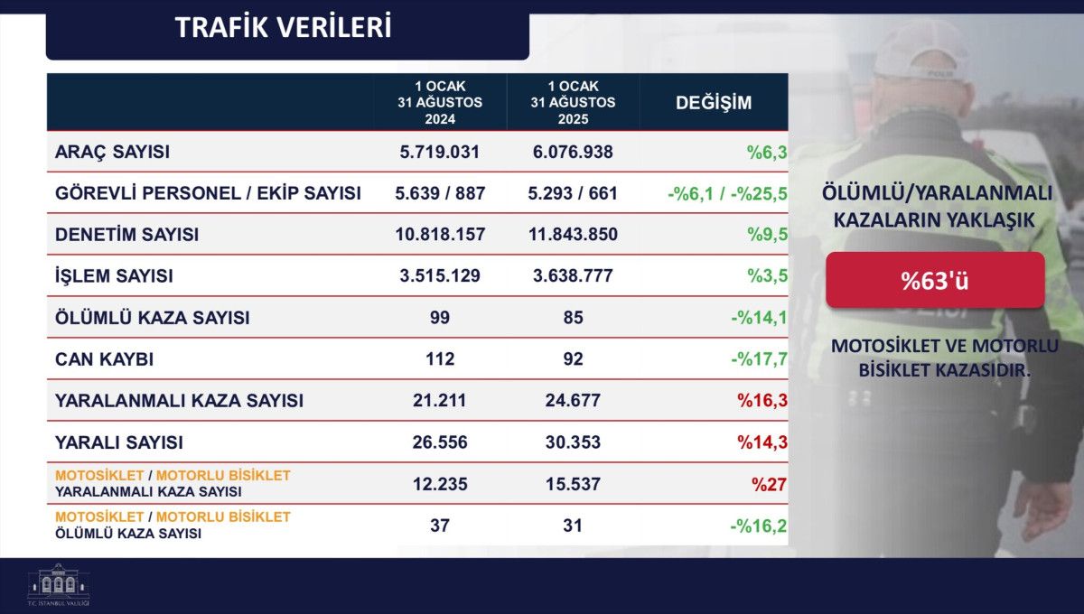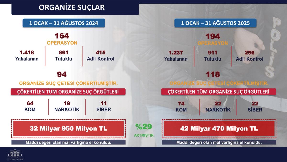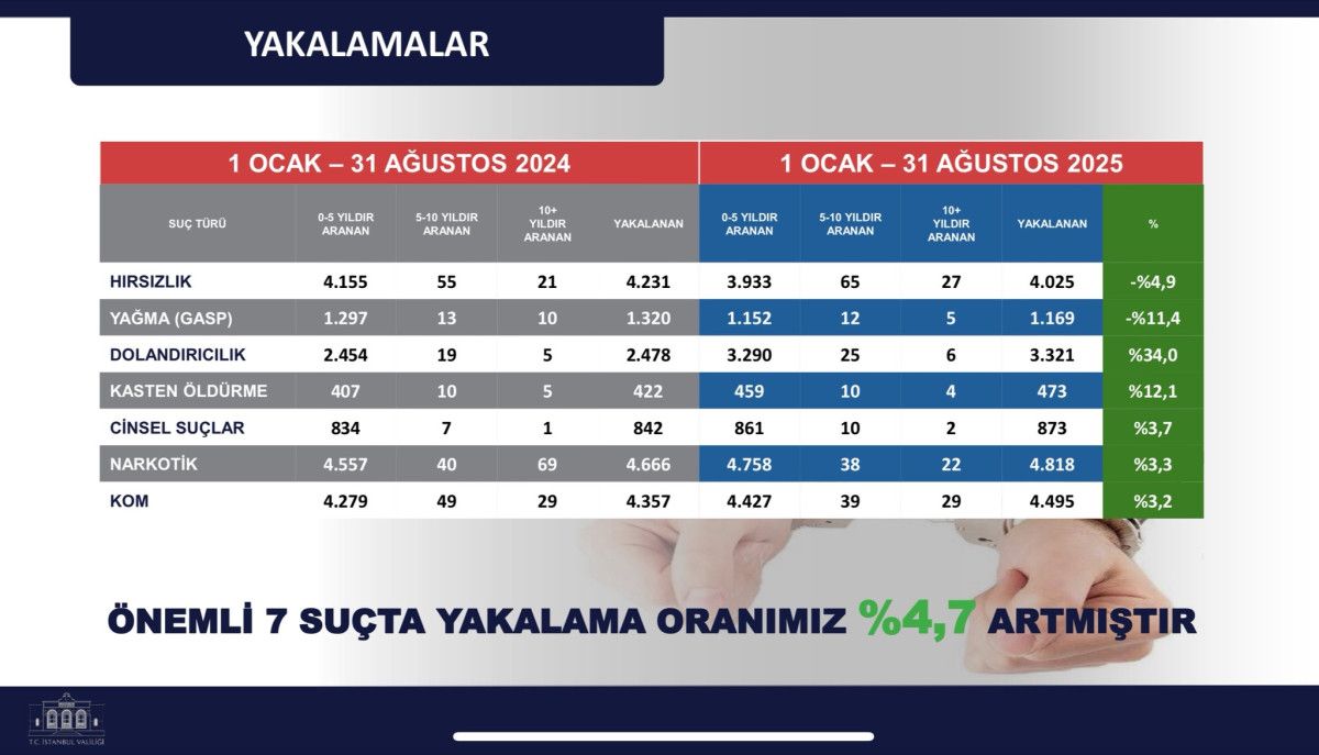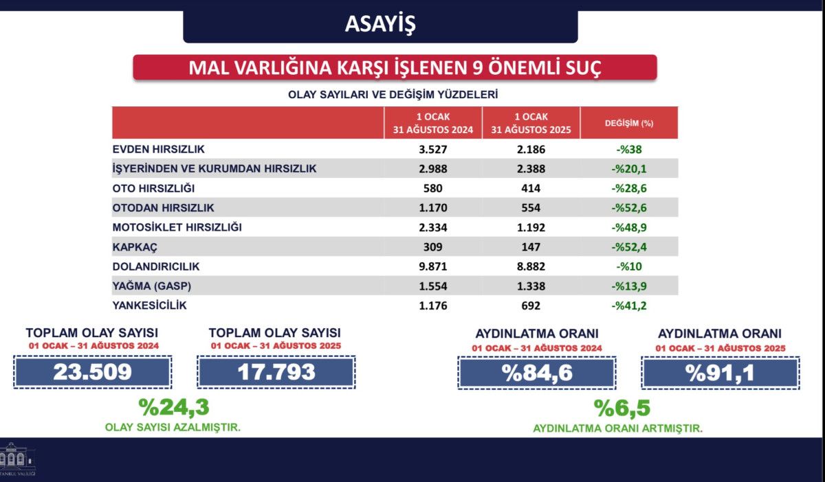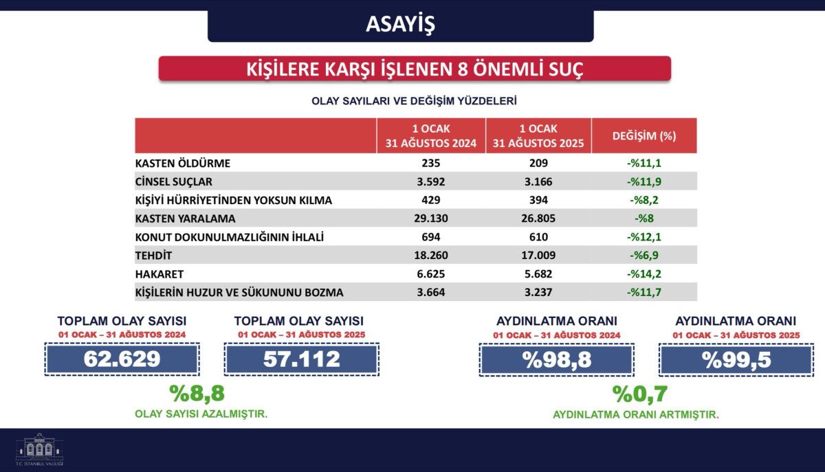 - İstanbul'da yılın ilk sekiz ayında suçla mücadelede kişilere ve mal varlığına karşı işlenen suçlarda azalma, suç aydınlatma oranlarında artış gözlemlendi.