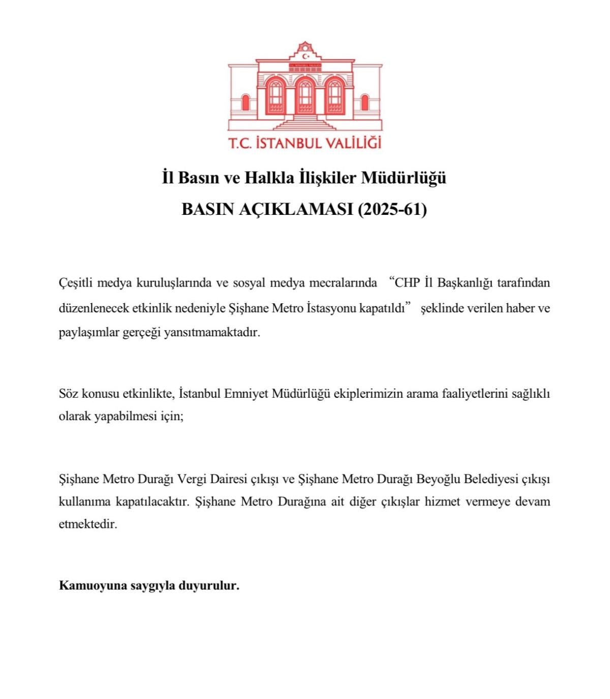 Çeşitli medya kuruluşlarında ve sosyal medya mecralarında “CHP İl Başkanlığı tarafından düzenlenecek etkinlik nedeniyle Şişhane Metro İstasyonu kapatıldı” şeklinde verilen haber ve paylaşımlar gerçeği yansıtmamaktadır.