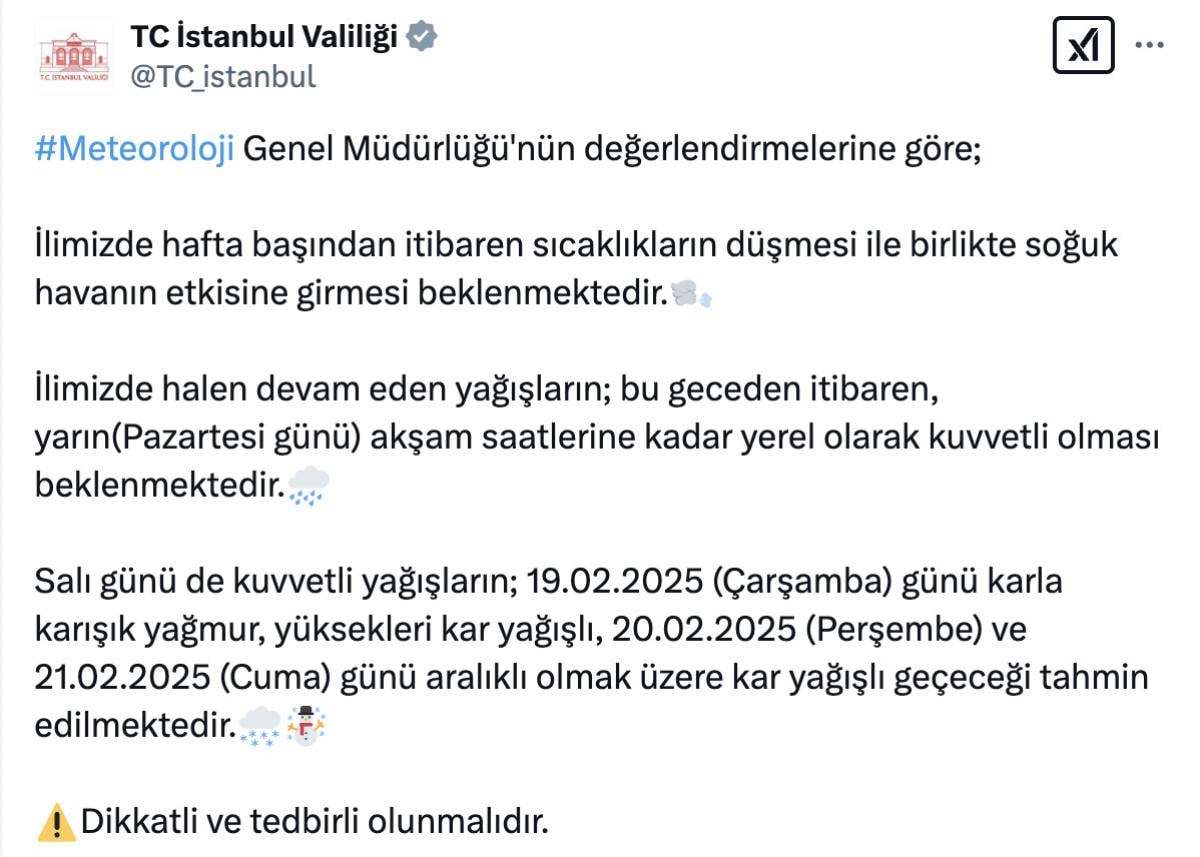 İstanbul'da Meteoroloji Genel Müdürlüğü'ne göre yağışların, sıcaklık düşüşü ile karla karışık yağmur ve kar şeklinde olmasının beklendiğini belirten Valilik, meydana gelebilecek kar yağışı ile buzlanma ve don olaylarına karşı dikkatli ve tedbirli olunmasını istedi.