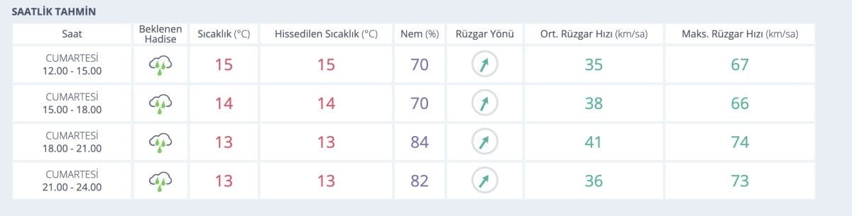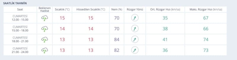 Rüzgarın Güneybatıdan (lodos) kuvvetli ve fırtına (50-75 km/sa), yer yer kuvvetli fırtına (80-90 km/sa) şeklinde eseceği tahmin ediliyor.