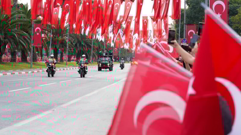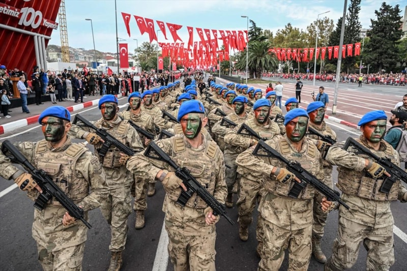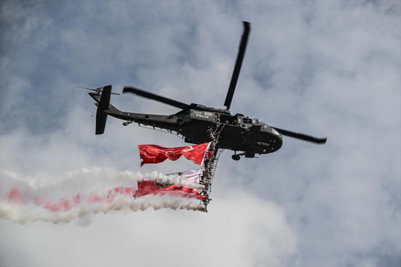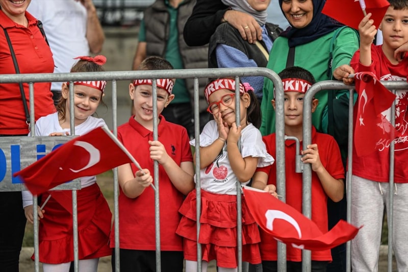 Askeri birlikler, polis araçları, itfaiye ekipleri, içerisinde şehit çocuklarının bulunduğu Türkiye'nin yerli otomobili Togg'lar, klasik otomobiller, öğrenciler ve sivil toplum kuruluşlarının katıldığı geçit töreninde, havadan da polis ve askeri helikopterler ile Sağlık Bakanlığı ambulans helikopteri Türk bayrağı açtı.