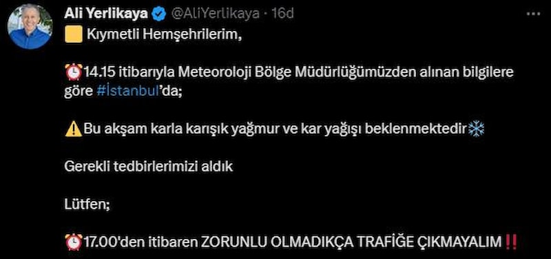 "Kıymetli Hemşehrilerim, 14.15 itibarıyla, Meteoroloji Bölge Müdürlüğü'müzden alınan bilgilere göre, İstanbul’da; bu akşam karla karışık yağmur ve kar yağışı beklenmektedir. Gerekli tedbirlerimizi aldık. Lütfen; 17.00'den itibaren zorunlu olmadıkça trafiğe çıkmayalım"