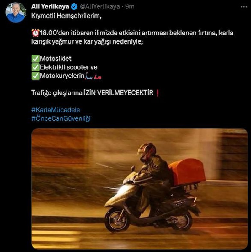 "Kıymetli Hemşehrilerim, saat 18.00'den itibaren ilimizde etkisini artırması beklenen fırtına, karla karışık yağmur ve kar yağışı nedeniyle; motosiklet, elektrikli scooter ve moto kuryelerin trafiğe çıkışlarına izin verilmeyecektir."