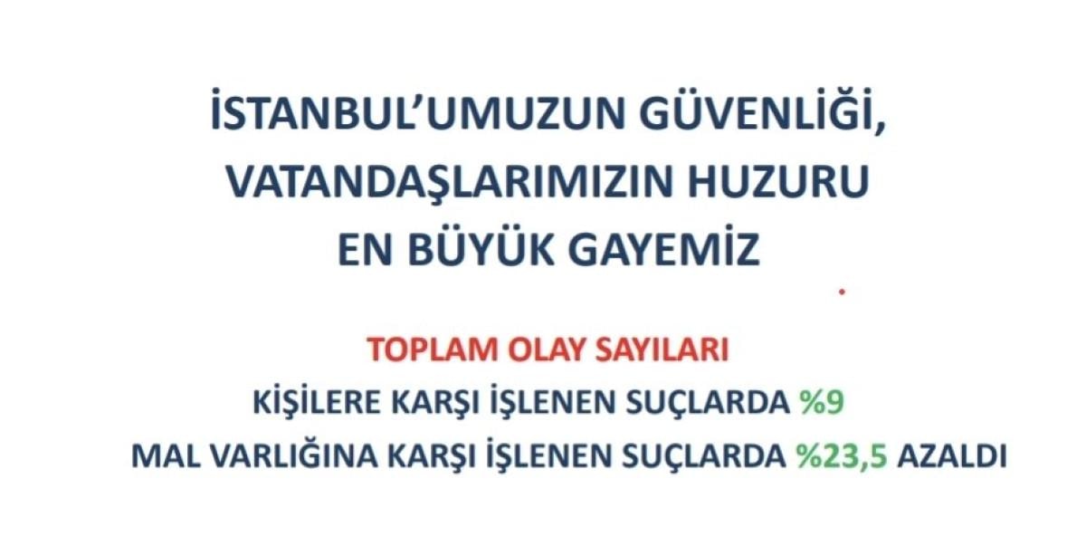 Bu yılın ilk 9 ayına baktığımızda kişilere karşı işlenen suçların, geçen yılın aynı dönemine göre yüzde 9 azaldığını, aydınlatma oranının ise yüzde 99,4'e yükseldiğini görüyoruz. Mal varlığına karşı işlenen suçlarda ise yüzde 23,5 azalma söz konusu. Aydınlatma oranının yüzde 91,3'e çıktığı bu suçlardan kapkaç, otodan hırsızlık, yankesicilik ve motosiklet hırsızlığı neredeyse yarı yarıya düşmüş durumda. Bu rakamlar bize şunu ifade ediyor; İstanbul'umuzun bugünü dünden daha huzurlu. Yine çeşitli suçlardan yıllardır aranan şahısların yakalanma oranı her geçen gün daha da artıyor. Suç potansiyeli taşıyan bu kişilerin sokaklarımızdan temizlenmesi, adalete teslim edilmesi demek, yarınımızın bugünden daha huzurlu olması demek.