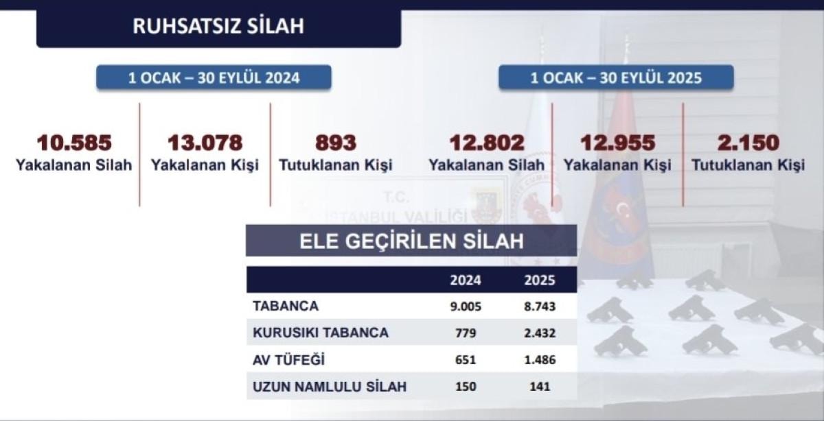 Yılın ilk 9 ayında ruhsatsız silah yakalanma oranının arttığını belirten Vali Gül, "Kararlılıkla mücadele ettiğimiz ikinci başlığımız ruhsatsız silahlar. Güvenlik güçlerimizin denetim ve operasyonları neticesinde bu yılın ilk 9 ayında ele geçirilen ruhsatsız silah sayısı, 2024'ün aynı dönemine göre yüzde 21, tutuklanan kişi sayısı ise yüzde 140 arttı. Silahla işlenen suçların çok büyük bir kısmında bu silahlar kullanılıyor. Dolayısıyla bu silahları taşıyanlar, bulunduranlar, ticaretini yapanlar şunu çok iyi bilsinler; bu bir suçtur ve bunun bir cezası vardır" şeklinde konuştu.