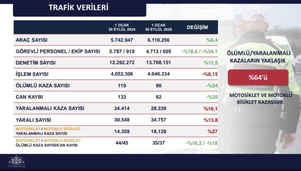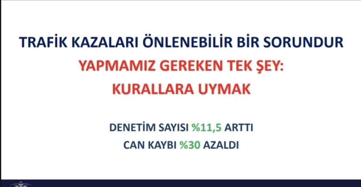 Ölümlü kaza oranlarını aktaran Vali Davut Gül, "Hepimizin hayatının bir parçası olan trafik bir diğer başlığımız. Güvenli ve düzenli bir ulaşım için ekiplerimizle denetimlerimize devam ediyoruz. Bütün gayemiz, trafikte can ve mal güvenliğini en üst düzeyde sağlamak, kazaların önüne geçmek. Hemşerilerimizin işlerine, evlatlarımızın okullarına sağ salim ulaşmalarını sağlamak. Hamdolsun, aldığımız tedbirler sayesinde bu yılın ilk 9 ayında geçen senenin aynı dönemine göre ölümlü kaza sayısı yüzde 24,can kaybı yüzde 30 azaldı. Ayrıca yaya can kaybı yüzde 17 azalırken, motosiklet kazalarında can kaybı sayısı yüzde 18 düştü" dedi.