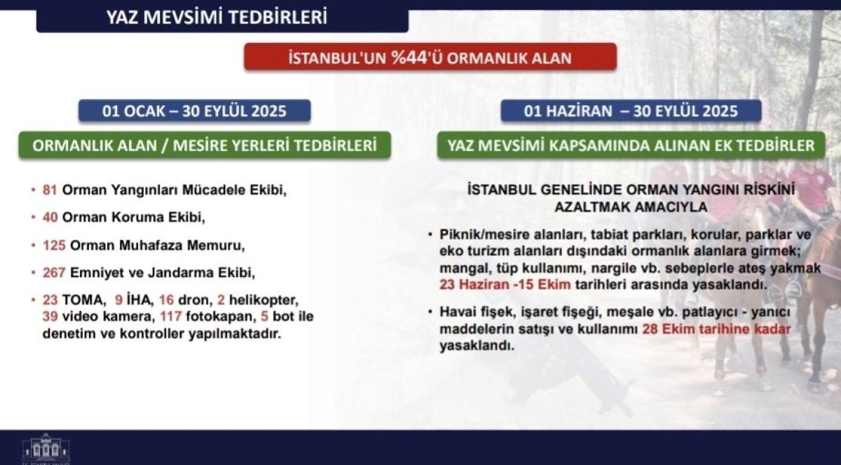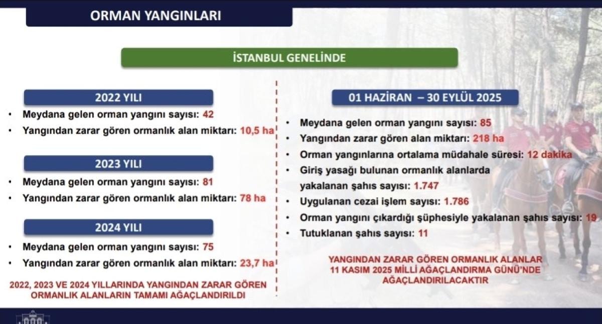 Bilgilerini paylaşacağımız son başlığımız yaz mevsimi tedbirleri. Bu yaz, rekor sıcaklıklar ve kuraklık sebebiyle ormanlarımız açısından riskli bir dönem yaşadık. Bu sebeple tüm imkanlarımızı seferber ettik. Ormanlık alanları korumak için tedbirlerimizi en üst düzeye çıkardık. Tüm bu önlemlerimize rağmen maalesef 85 orman yangını meydana geldi. 218 hektar ormanlık alan zarar gördü. Nasıl, önceki yıllarda kaybettiğimiz her bir fidanın yerine yenisini diktiysek, yanan ormanlık alanlarımızı yeniden ağaçlandırdıysak bu yıl zarar gören alanları da 11 Kasım Milli Ağaçlandırma Günü'nde yeniden ağaçlandıracağız.