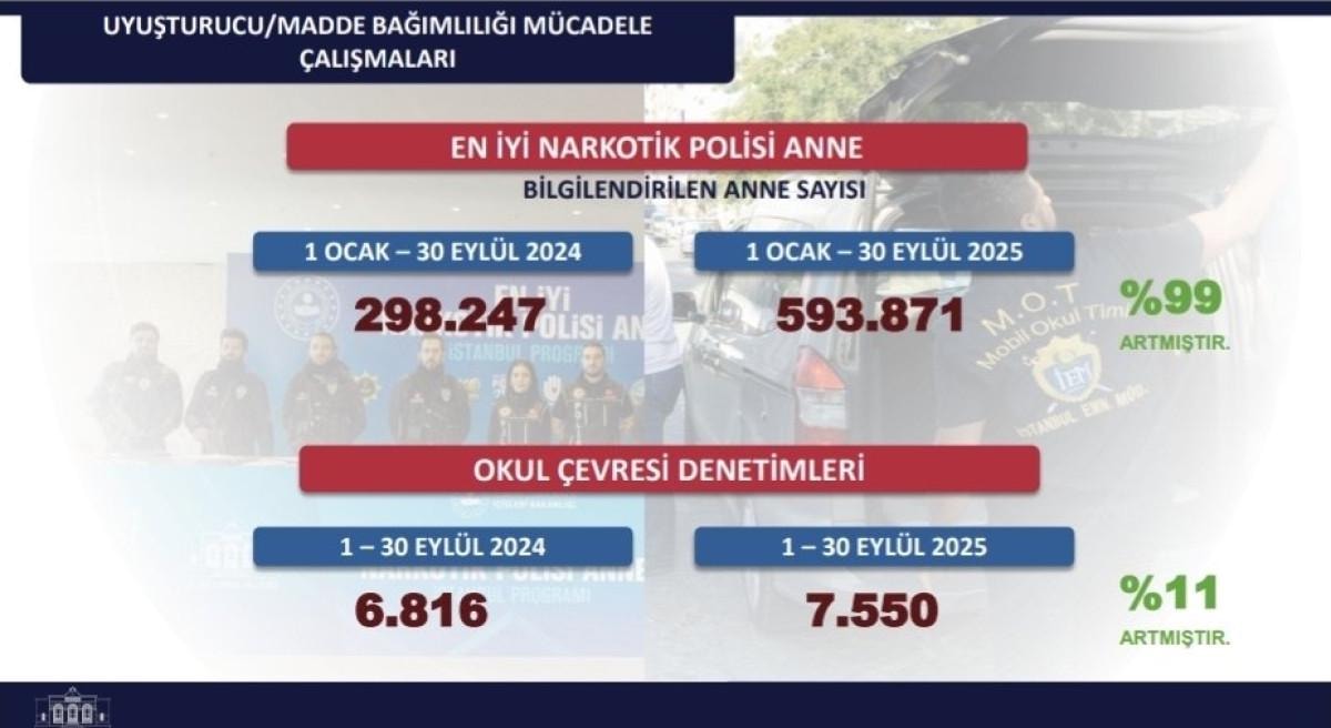 Geçen yılın ilk dönemine göre uyuşturucu imal ve ticareti yapan şüphelilere yönelik operasyonların arttığını ifade eden Vali Davut Gül, "Sadece bugünümüzü değil aynı zamanda geleceğimizi tehdit eden uyuşturucu ve madde bağımlılığı mücadele ettiğimiz bir diğer önemli başlık. Bu yılın ilk 9 ayında imal ve ticarete yönelik operasyonlarımız geçen senenin aynı dönemine göre yüzde 15 arttı. Ele geçirilen uyuşturucu hap miktarı 2 katına çıktı. Kenevir miktarı ise 3 katını aşarak 25 bin 667 köke ulaştı. Okullarımızın çevresindeki kafelerde, parklarda, bahçelerde denetimlerimiz artarak devam ediyor. Uyuşturucu ile mücadelede en büyük gücümüz, toplumsal bilincimiz. Bu anlayışla başlatılan En İyi Narkotik Polisi Anne projemizle bilinçlendirdiğimiz annelerimizin sayısı geçen senenin aynı dönemine göre 2 katına çıktı" şeklinde konuştu.