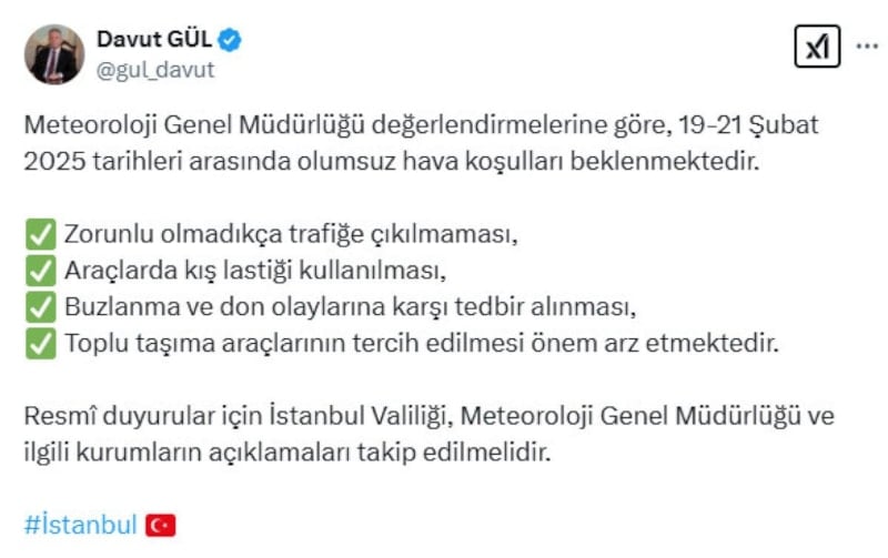 Gül, resmi duyurular için İstanbul Valiliği, Meteoroloji Genel Müdürlüğü ve ilgili kurumların açıklamalarının takip edilmesini istedi.