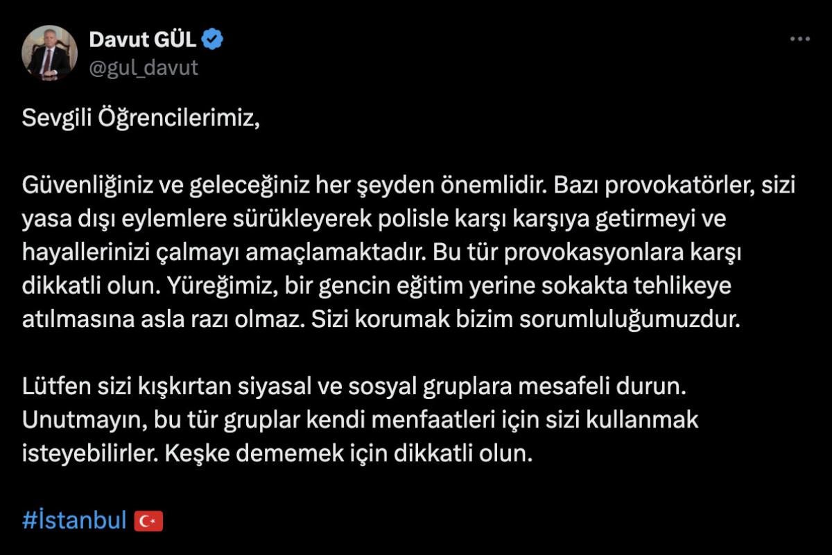 Paylaşımında öğrencilere seslenen İstanbul Valisi, "Bazı provokatörler sizi yasa dışı eylemlere sürükleyerek polisle karşı karşıya getirmeyi ve hayallerinizi çalmayı amaçlamaktadır." dedi.