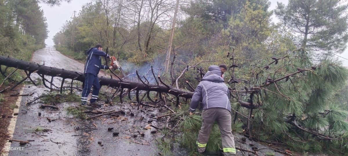 Otomobilin ön camı ve tavanında hasar oluştu, ağacın kaldırılmasının ardından yol yeniden trafiğe açıldı.