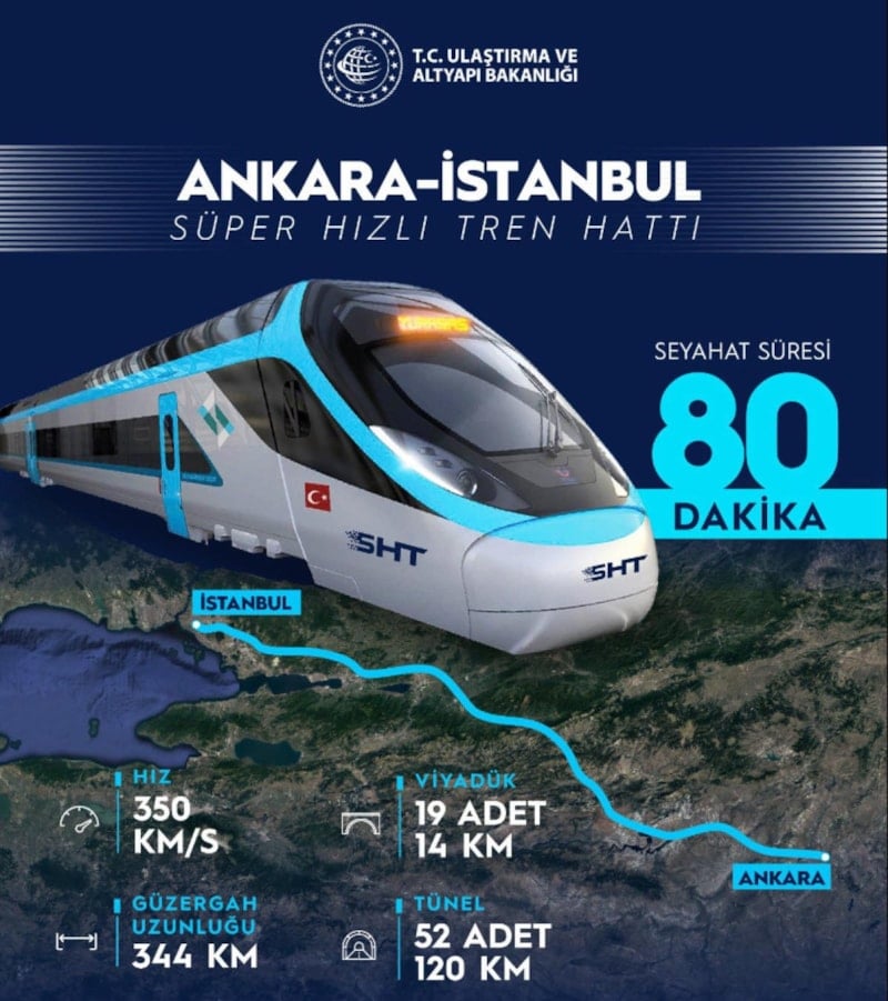 Ankara-İstanbul Süper Hızlı Tren Hattı proje çalışmalarını başlattık. Süper hızlı tren hattımızda saatte 350 kilometre hıza ulaşacak trenlerimizle seyahat süresini 80 dakikaya indireceğiz.