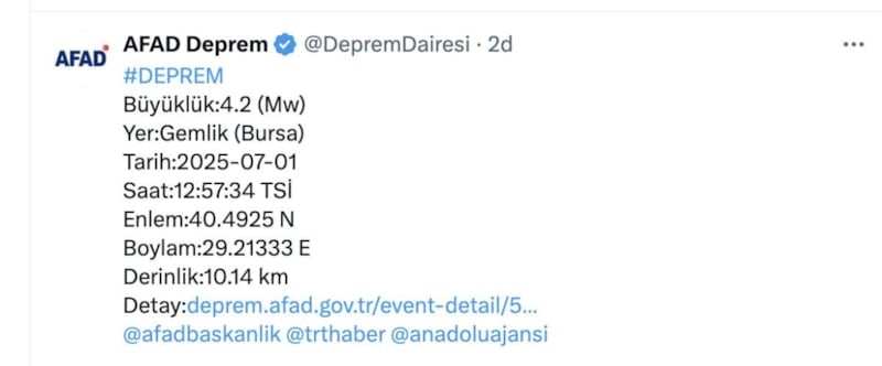 İstanbul, Bursa ve Yalova'da hissedilen bir deprem meydana geldi. AFAD depremin büyüklüğünü 3.9, merkez üssünü ise Bursa Gemlik olarak açıkladı. Geçtiğimiz dakikalarda ise bir deprem daha meydana geldi.