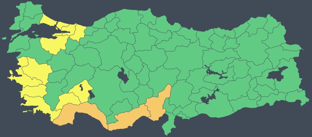 Adana, Antalya ve Mersin turuncu uyarı verilen iller olarak sıralanırken Aydın, Burdur, Bursa, Isparta, İstanbul, İzmir, Kocaeli, Manisa, Muğla, Sakarya ve Yalova'ya ise sarı uyarı verildi.