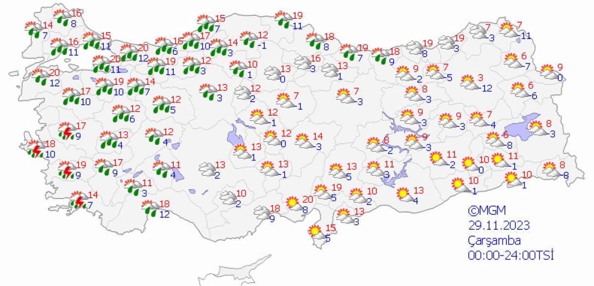 İstanbul Valiliği'nden yapılan açıklamada, "Yapılan son değerlendirmelere göre gece saatlerinden sonra İstanbul Avrupa Yakası'ndan başlayarak 29.11.2023 Çarşamba günü sabah saatlerinden itibaren İstanbul il genelinde yerel olarak kuvvetli sağanak ve gök gürültülü yağış beklenmektedir." denilirken ani sel, su baskını, yıldırım, yerel dolu yağışı, ani kuvvetli rüzgar ve kısa süreli fırtına ile ulaşımda aksamalar olabileceğini belirtilerek vatandaşlar uyarıldı.