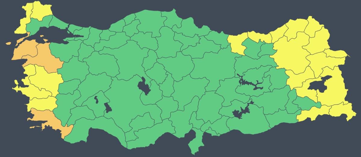 Balıkesir, Çanakkale ve Muğla turuncu uyarı verilen iller olarak sıralanırken Ağrı, Ardahan, Artvin, Aydın, Bitlis, Edirne, Erzurum, Giresun, Hakkari, Iğdır, İzmir, Kars, Kırklareli, Manisa, Muş, Rize, Şırnak, Trabzon ve Van'a ise sarı uyarı verildi.