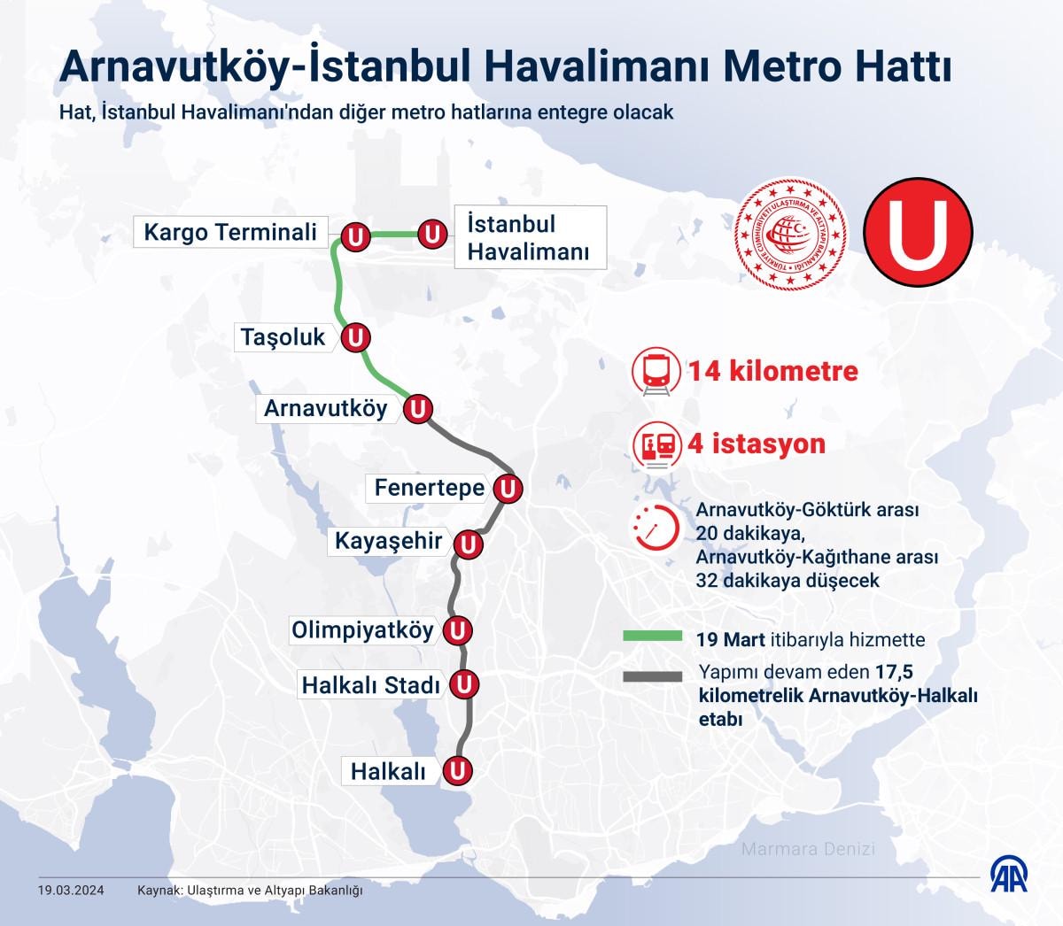 Yeni hat; Arnavutköy, Taşoluk, İstanbul Havalimanı Kargo ve İstanbul Havalimanı Terminal olmak üzere 4 istasyondan oluşuyor.