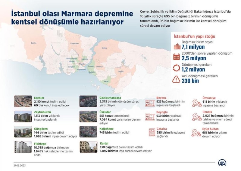 Çevre, Şehircilik ve İklim Değişikliği Bakanlığı'nın İstanbul'da 10 yılda yaptığı kentsel dönüşüm çalışmaları güven verdi. İşte ilçe ilçe çalışmalar...