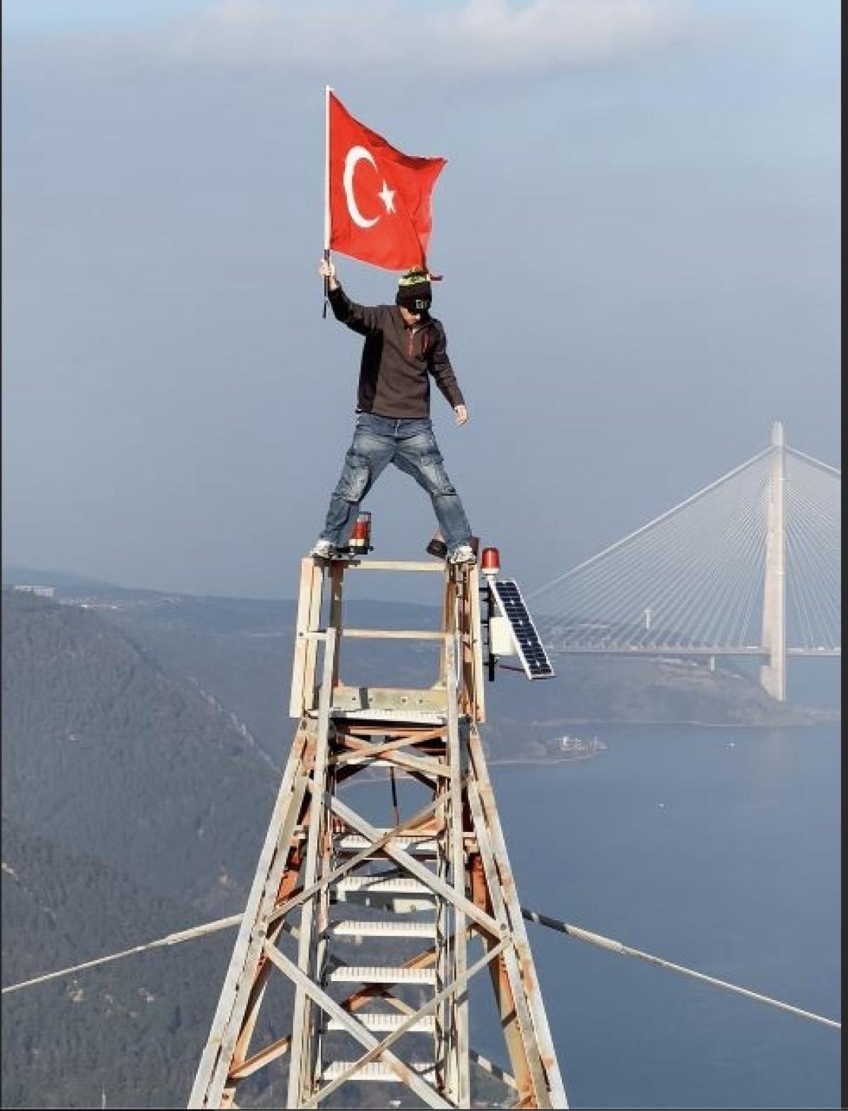 3. Boğaz köprüsü Yavuz Sultan Selim Köprüsü'nün kulesine tırmanarak “350 metre” yükseklikte selfie yapan Pavel Smirnov bu kez bolu da otel yangınında vefat edenlerin anısına 150 metre yükseklikteki elektrik iletim kulesine tırmanarak Türk bayrağı açtı.