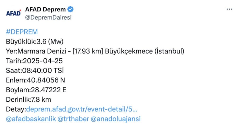 İstanbul'da hissedilen bir deprem daha oldu. AFAD, depremin büyüklüğünü 3.6 olarak X hesabından açıkladı.