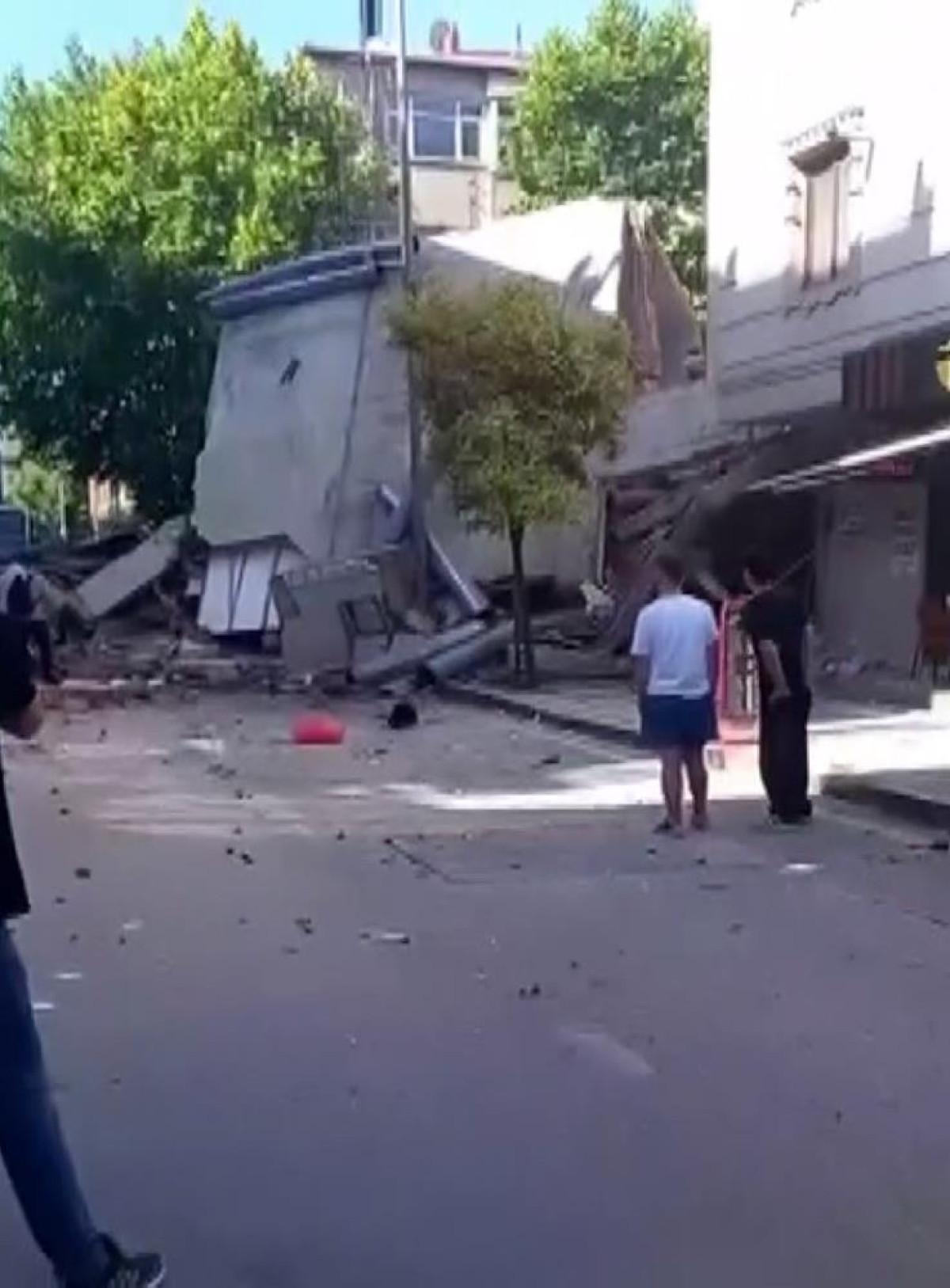 Çöken bina park halindeki araçların üzerine yıkılırken, yoldan geçen belediye otobüsünde de hasar oluştu.