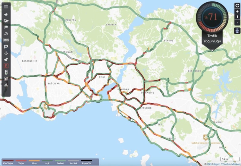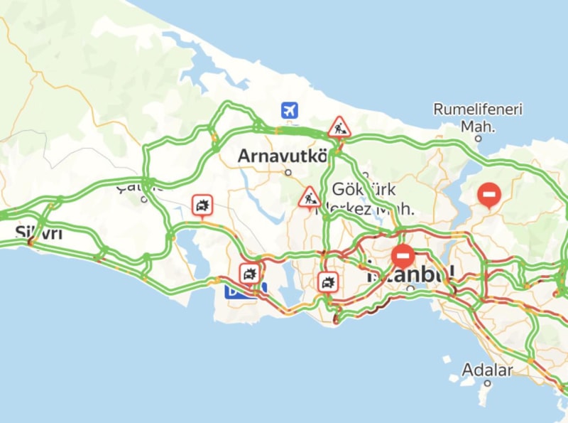 Haritada özellikle ana arterlerde ve köprü geçişlerinde yoğunluk yaşandığı görüldü.