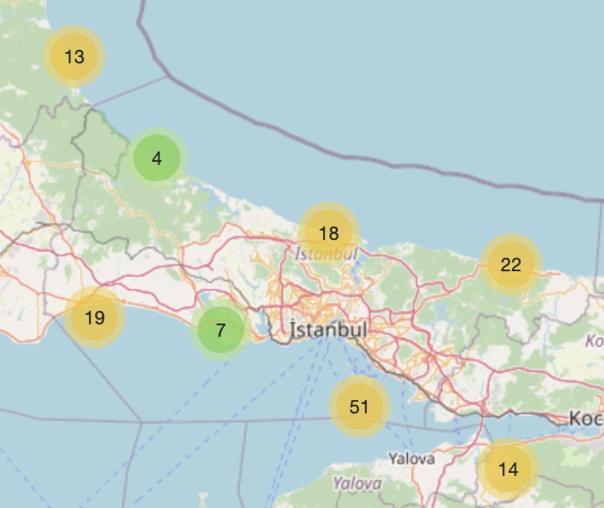 Durusu Karaburun Arka Deniz, Durusu Karaburun Öndeniz Batı Tarafı, Durusu Karaburun Öndeniz Doğu Tarafı, Arnavutköy Yeniköy Halk Plajı, Yeniköy Sahili Köpek Çiftliği önü, Denizköşkler, Florya Güneş Plajı, Yeşilköy Polis Merkezi önü, Yeşilköy International Hospital önü, Riva Elmasburnu Tabiat Parkı Plajı, Riva Plajı, Riva Su Ürünleri Plajı, Beylikdüzü Gürpınar Sahili Halk Plajı, West İstanbul Marina Plajı, Gürpınar Sahili, Albatros Sahili, Büyükçekmece Çocuk Sahili, Büyükçekmece Halk Plajı, Mimarsinan Sahili, Kumburgaz Sahili, Celaliye Halk Plajı, Kamiloba Halk Plajı Ağar Kamping,