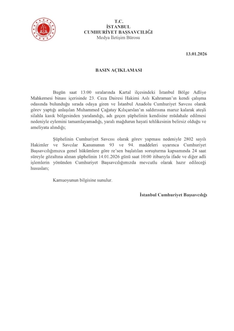 İstanbul Cumhuriyet Başsavcılığı tarafından yapılan yazılı açıklamada, saldırının hakimin kendi çalışma odasında gerçekleştiği belirtildi. Açıklamada, hakimin hayati durumunun belirsizliğini koruduğu ve ameliyata alındığı, şüphelinin savcı olması nedeniyle 2802 sayılı Hakimler ve Savcılar Kanunu’nun ilgili maddeleri uyarınca re’sen soruşturma başlatıldığı ve şüphelinin 24 saat süreyle gözaltına alındığı ifade edildi.