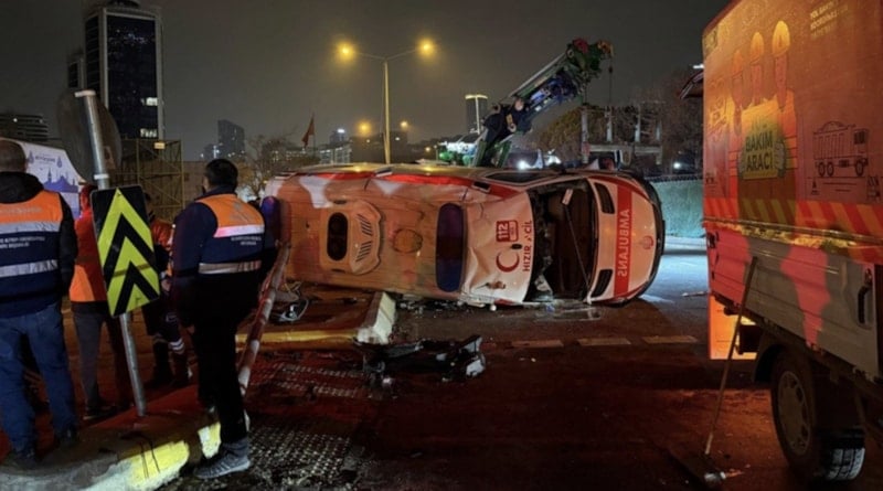 Çarpışmanın etkisiyle takla atan ambulanstaki 2 sağlık görevlisi ve 1 hasta yaralandı.