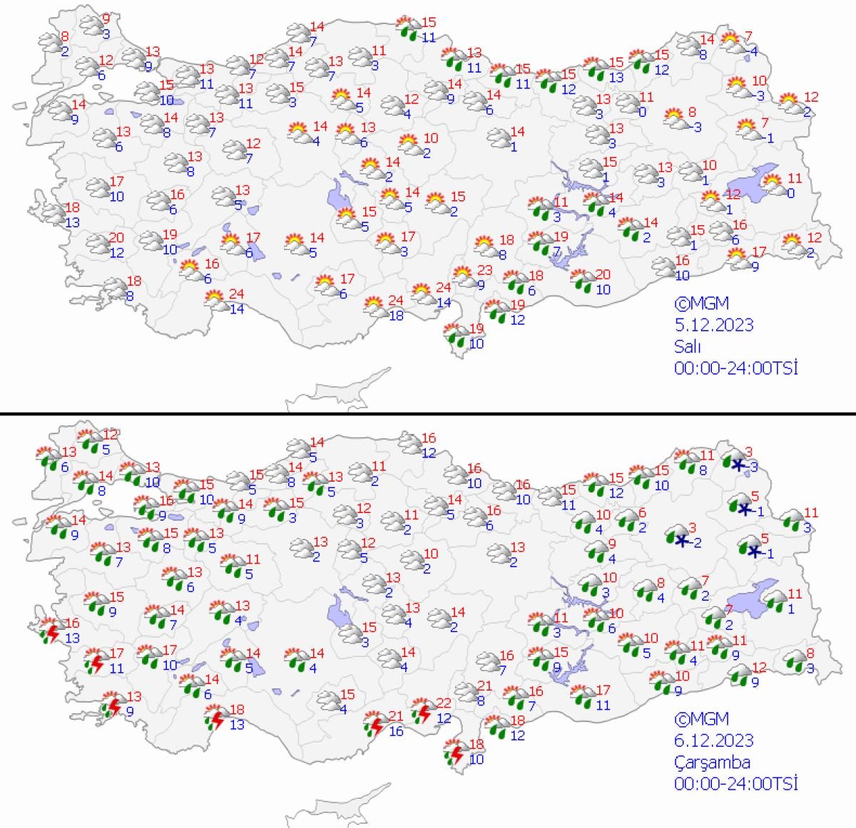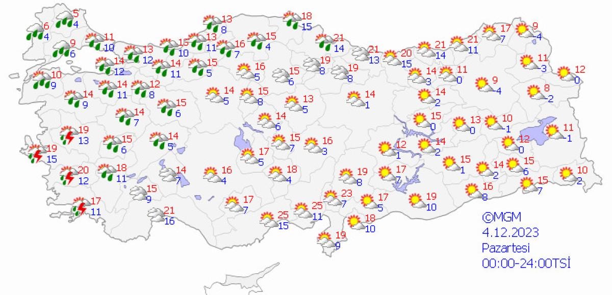 MGM'nin sosyal medya hesabından yapılan paylaşımda haftanın ilk günü kuzeybatı kesimlerinde azalarak mevsim normalleri civarına düşecek olan hava sıcaklıklarının diğer bölgelerde ise mevsim normallerinin üzerinde seyretmeye devam edeceğinin tahmin edildiği ifade edildi.