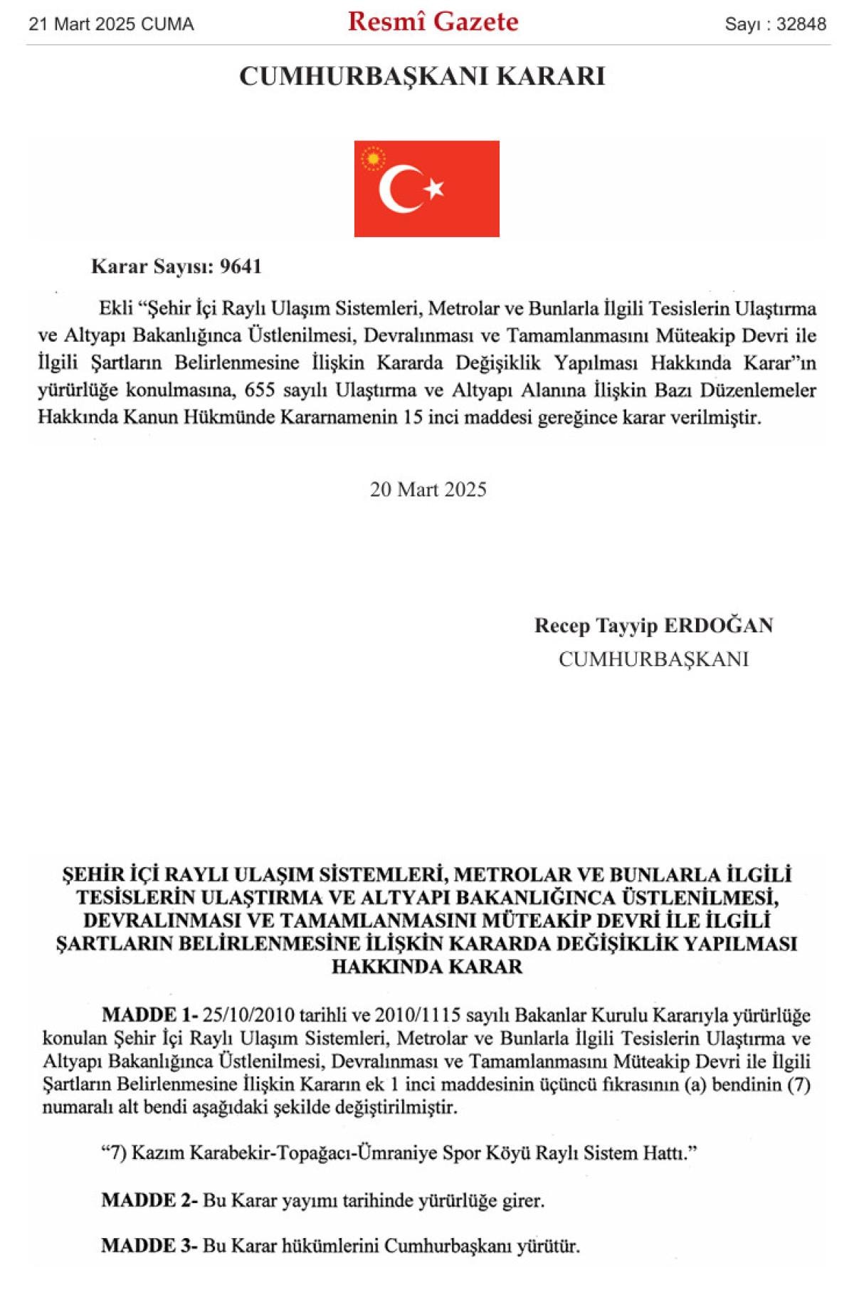 Resmi Gazete'deki kararda, "Ekli 'Şehir İçi Raylı Ulaşım Sistemleri, Metrolar ve Bunlarla İlgili Tesislerin Ulaştırma ve Altyapı Bakanlığınca Üstlenilmesi, Devralınması ve Tamamlanmasını Müteakip Devri ile İlgili Şartların Belirlenmesine İlişkin Kararda Değişiklik Yapılması Hakkında Karar'ın yürürlüğe konulmasına, 655 sayılı Ulaştırma ve Altyapı Alanına İlişkin Bazı Düzenlemeler Hakkında Kanun Hükmünde Kararnamenin 15 inci maddesi gereğince karar verilmiştir" denildi.