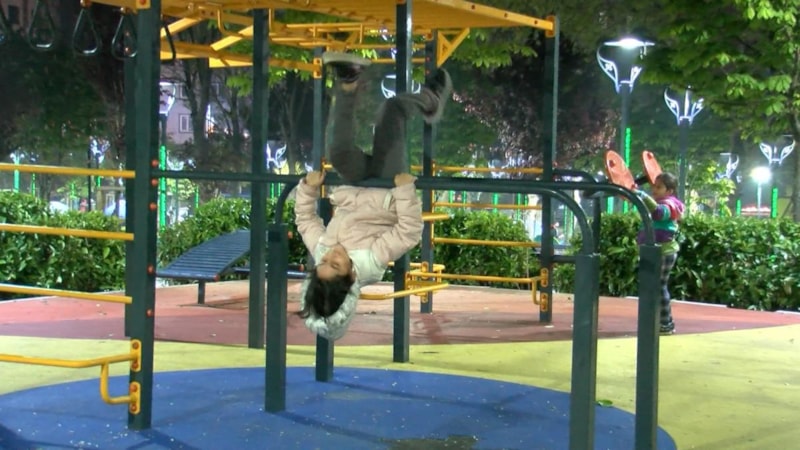Çocuklar parktaki oyun gruplarında oynarken, gençler top oynadı.
