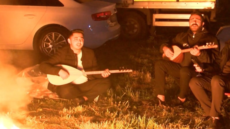 Yine Bahçelievler'de bulunan açık bir alanda geceyi geçiren vatandaşlar ise semaverde demledikleri çayın eşliğinde bağlama çalıp türkü söyleyerek vakit geçirdi.