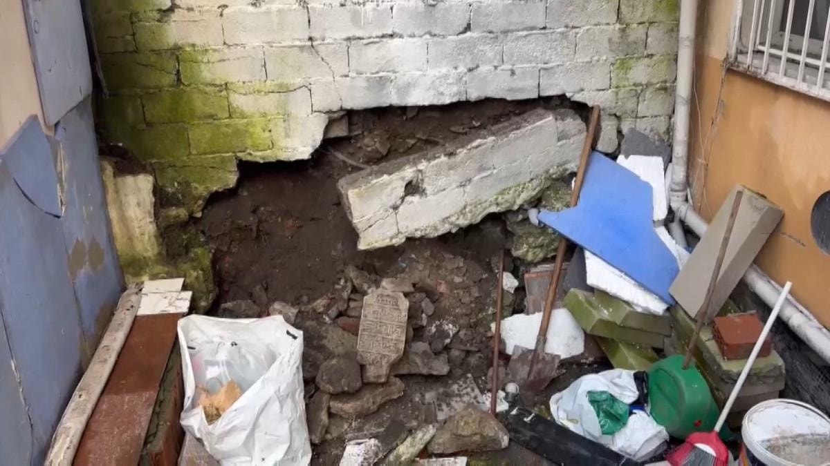 İhbar üzerine adrese gelen belediye ekipleri, kısmen çöken duvarın molozlarının arasında 1232 yılına ait olduğu değerlendirilen mezar taşını buldu.