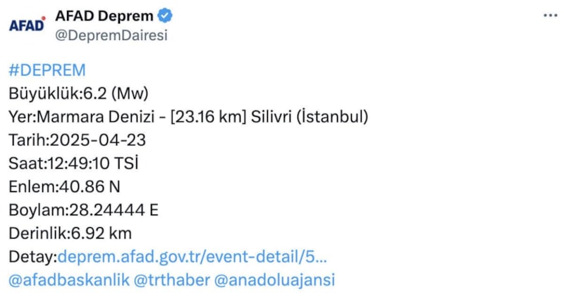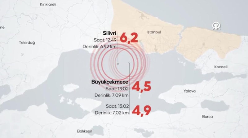Yapılan açıklamada İstanbul'un 6.2 ile sallandığı duyuruldu.