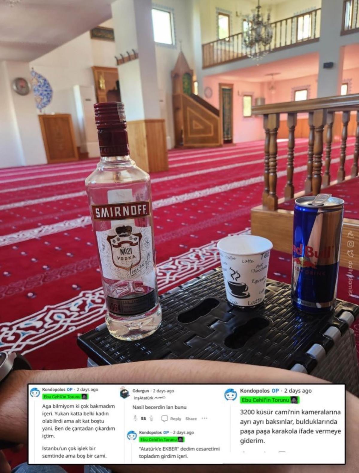 İstanbul'da camiye giren bir kişi, cami içinde bulunan bir tabureye alkol ve enerji içeceği koyarak çektiği fotoğrafı, "Atatürk'e ekber dedim cesaretimi topladım, girdim içeri" şeklindeki ifadelerle Reddit sosyal medyasında paylaştı.