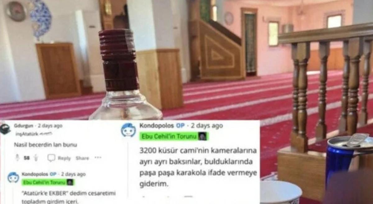 Reddit isimli platformdaki hesabımdan yapılan cami içerisinde alkol şişesinin olduğu fotoğrafı ben paylaştım. arkadaşımla beraber camiye 3-4 km uzaklıktaki bir parkta alkol aldım. Caminin avlusunda otururken votka şişesini çıkardım, az bir şey içtim. Daha sonra midem bulandı bardakta ki votkayı döktüm. Sosyal medyada geziniyordum, Can Demir K. isimli sahsın videosunu izlerken bende cami içinde votka ile fotoğraf çektim bu arada Redbull ve pet bardak boştu cami içinde alkol almadım. Sadece mizah amaçlı bir fotoğraf çektim. Yaptığım paylaşımdan dolayı pişmanım.