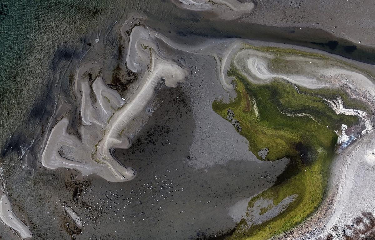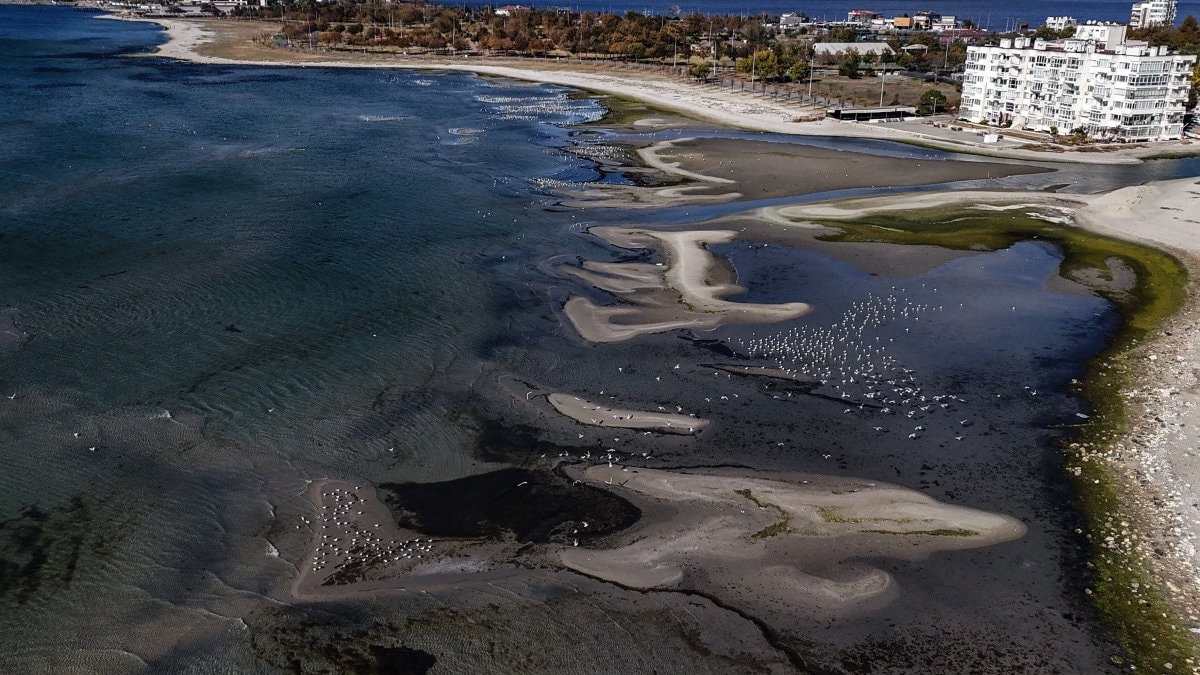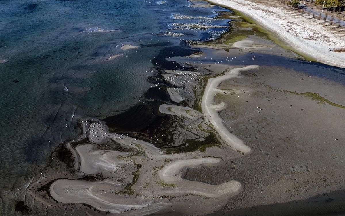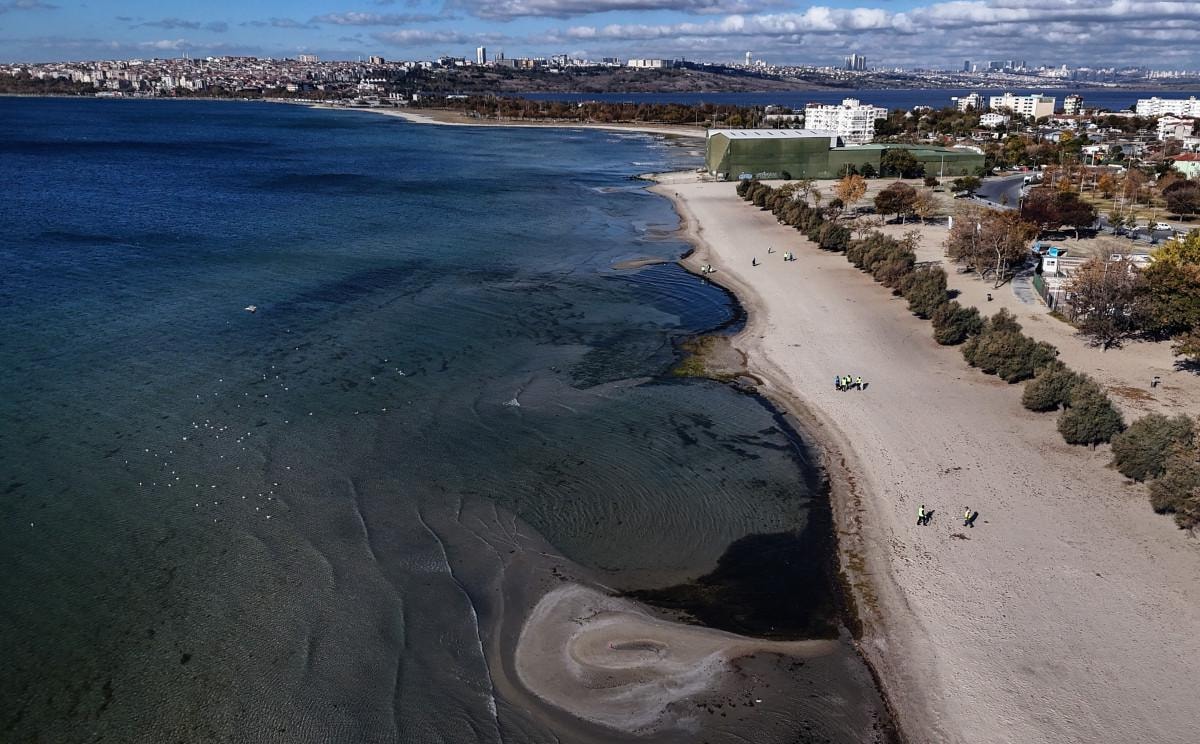 Havadan çekilen görüntülerde, sahil şeridi boyunca adacıkların oluştuğu ve deniz suyunun metrelerce çekildiği görüldü.