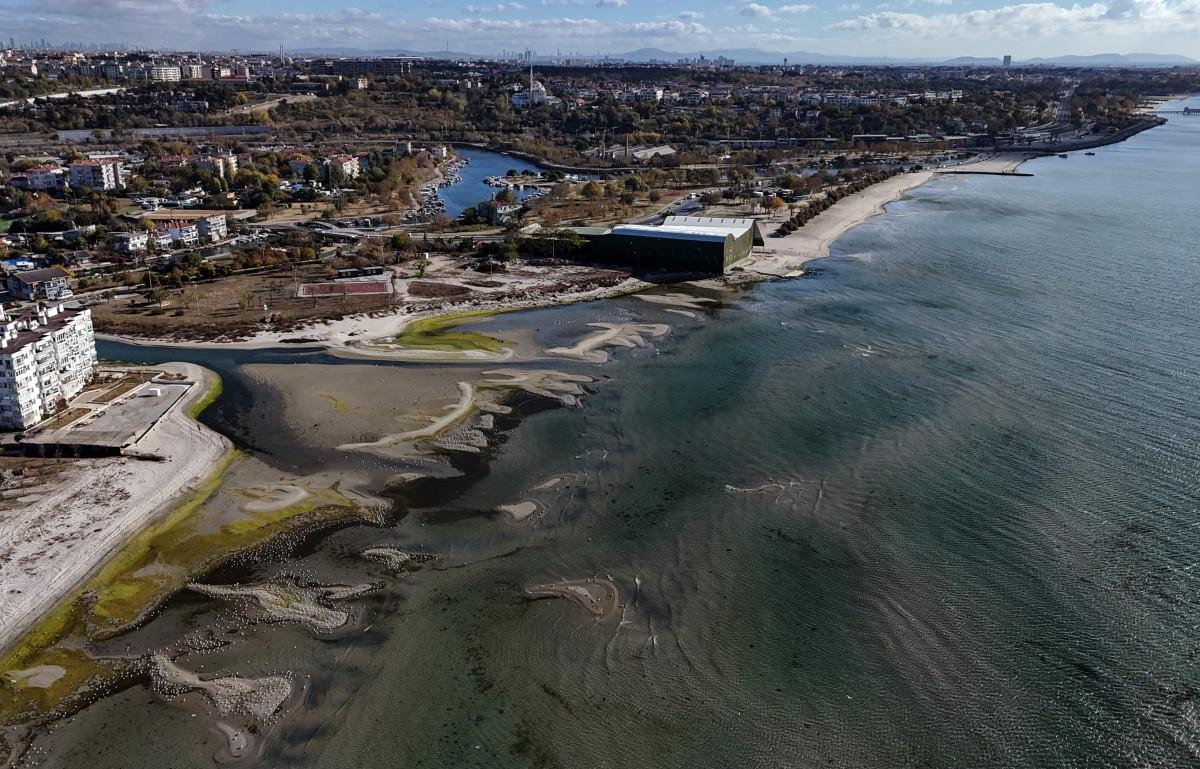 İstanbul Küçükçekmece’deki Menekşe Sahili’nde deniz suyu çekilerek, sahil boyunca küçük adacıklar oluştu.