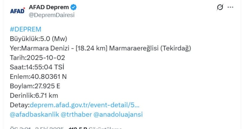 AFAD'ın açıklamasına göre depremin büyüklüğü 5.0 ve Tekirdağ merkezli olarak belirlendi.