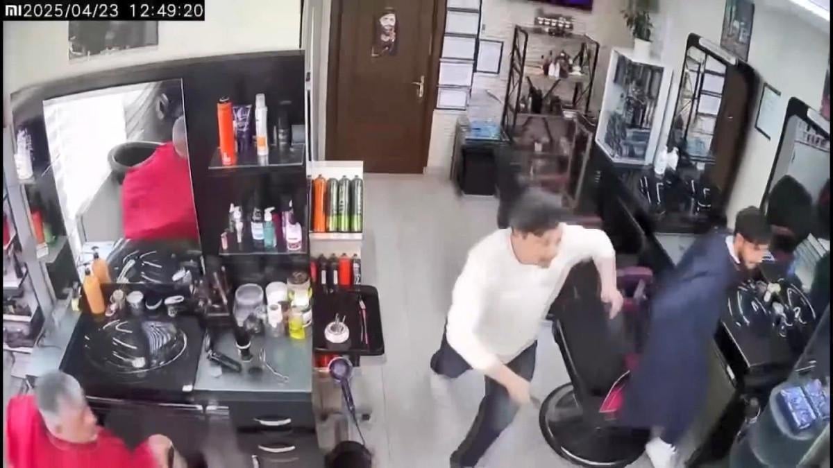 Müşterinin saç tıraşı olduğu sırada depreme yakalandığı anlarda, berberde bulunanlar 'Allah' diyerek dışarı koşuyor.