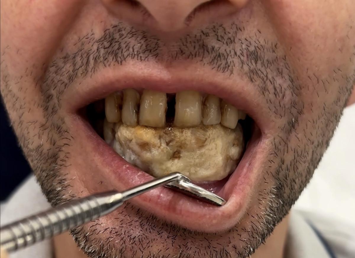 Sallanan dişlerini yapıştırmak için katman katman Japon yapıştırıcısı süren adamın ağzının halini gören diş hekimi, 'Bu kansorejendir, bu yapılır mı böyle?' ifadelerini kullandı.