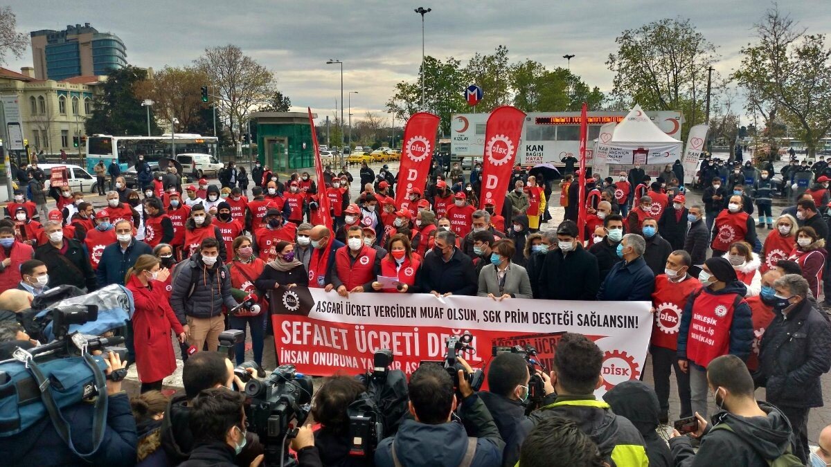 Devrimci İşçi Sendikaları Konfederasyonu (DİSK), Asgari Ücret Tespit Komisyonu'nun son basın toplantısının ardından Kadıköy İskelesi'nin önünde toplandı.
