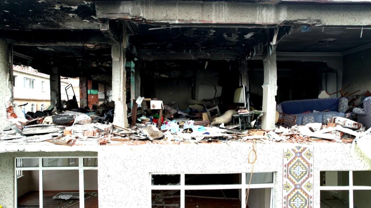 Görüntülerde, patlamanın yaşandığı dairenin tamamen harabe haline döndüğü, merdivenlerde ise göçme meydana geldiği görüldü.