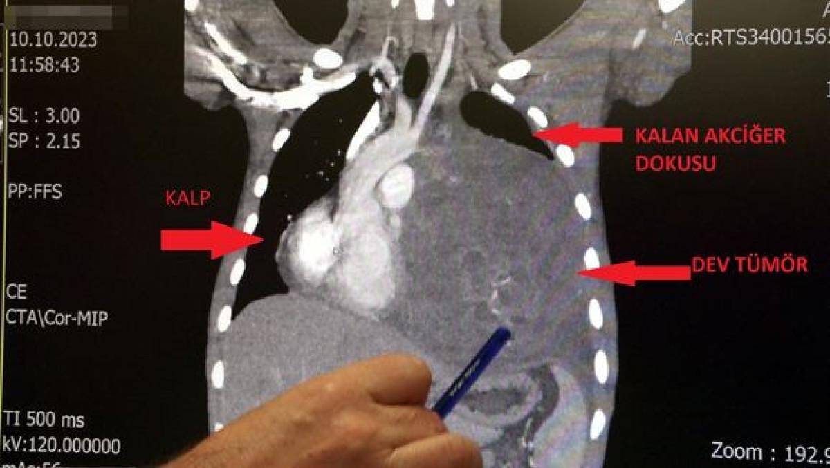 Sol akciğerinin yüzde seksenini kağıt gibi ezen, kalbini göğüs duvarında 12 santim sağa kaydıran ve hem kalbe hem beyne giden ana damarlara baskı yapan 6.5 kilo ağırlığındaki dev tümör, doktorların birlikte girdiği operasyonla başarılı şekilde çıkarıldı.