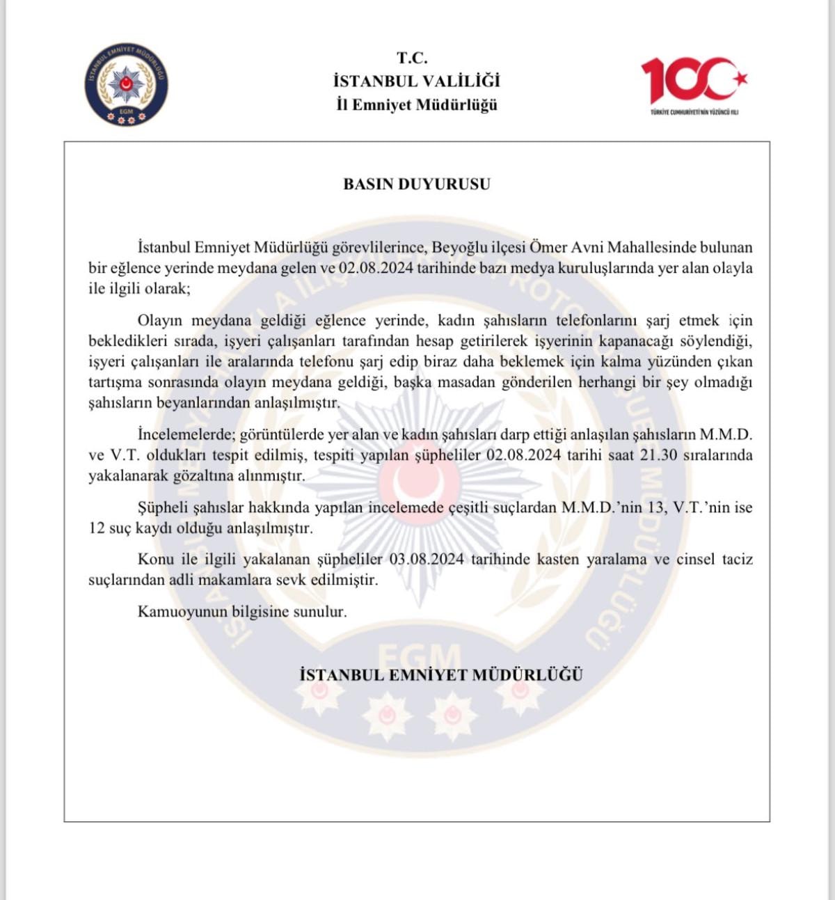 İstanbul Emniyet Müdürlüğü görevlilerince, Beyoğlu ilçesi Ömer Avni Mahallesinde bulunan bir eğlence yerinde meydana gelen ve 02.08.2024 tarihinde bazı medya kuruluşlarında yer alan olayla ile ilgili olarak;