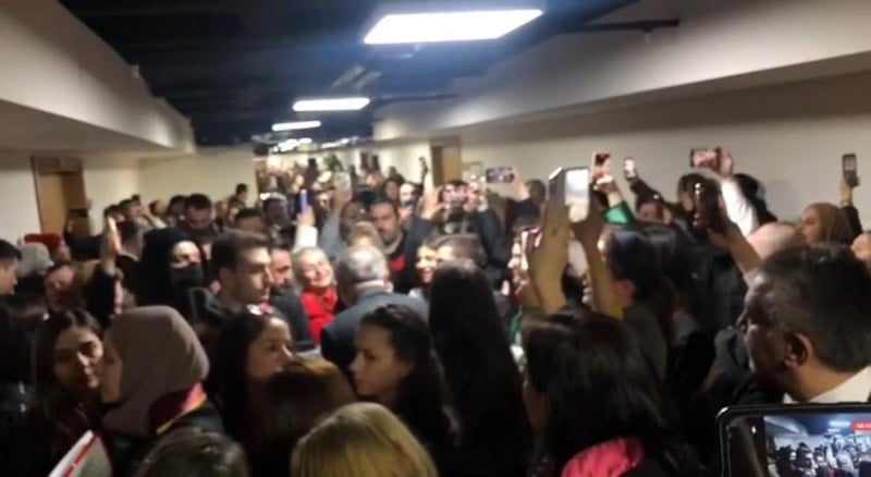 Polis ekiplerinin geniş güvenlik önlemleri almasına rağmen mahkeme salonunun kapısının yumruklarla zorlanmasının ardından duruşma büyük salona alındı.